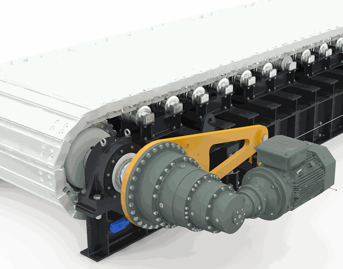 Consisting of articulated metal plates (steel or cast metal), the apron feeder works in principle like a conveyor belt. The aprons are supported by rollers and rotates slowly between the drive pinion and the tail pinion.