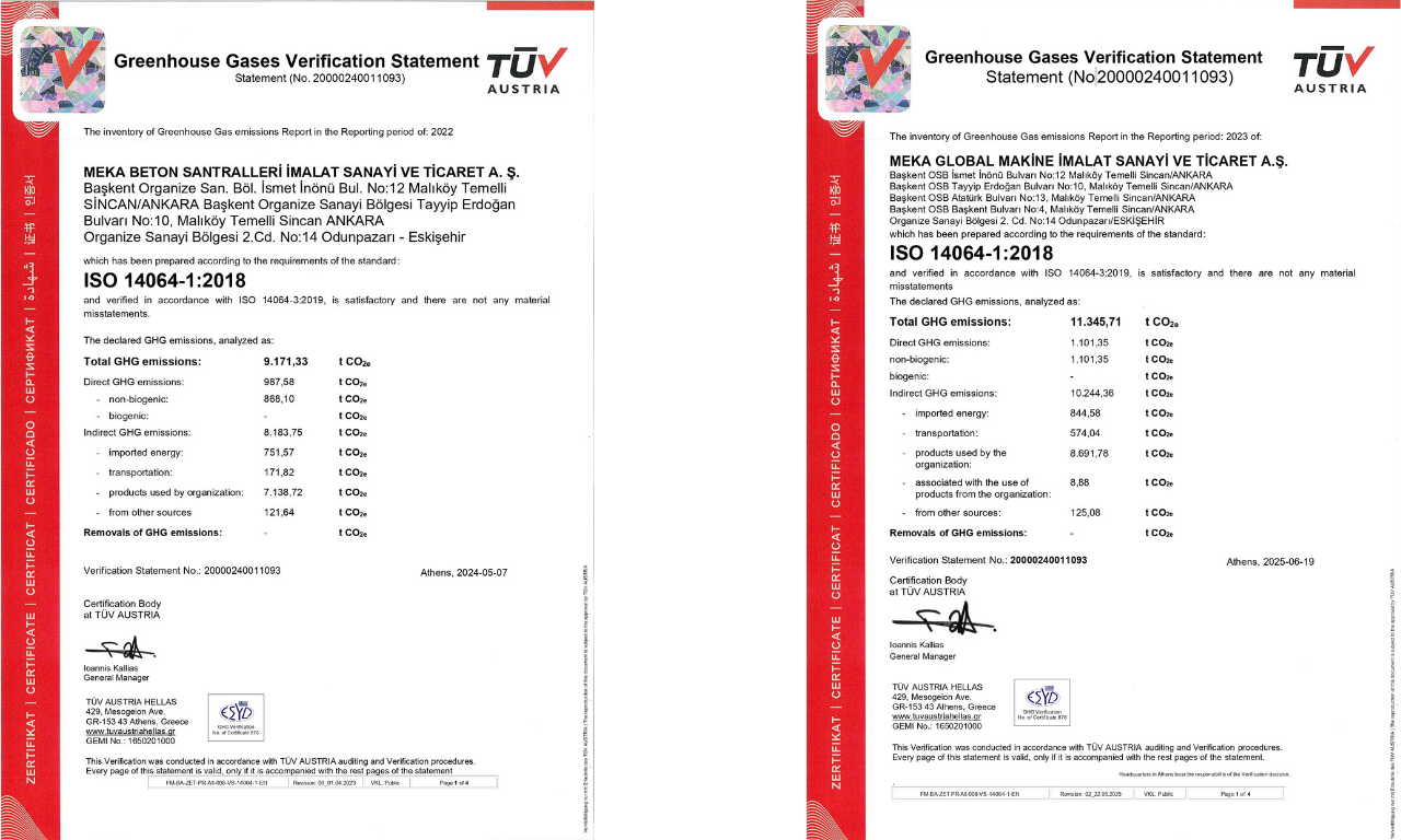 Bağımsız ve akredite bir kuruluş olan TÜV Austria tarafından yürütülen doğrulama süreci sonucunda MEKA, ISO 14064-1: Greenhouse Gases Verification Statement sertifikasını almaya hak kazandı.