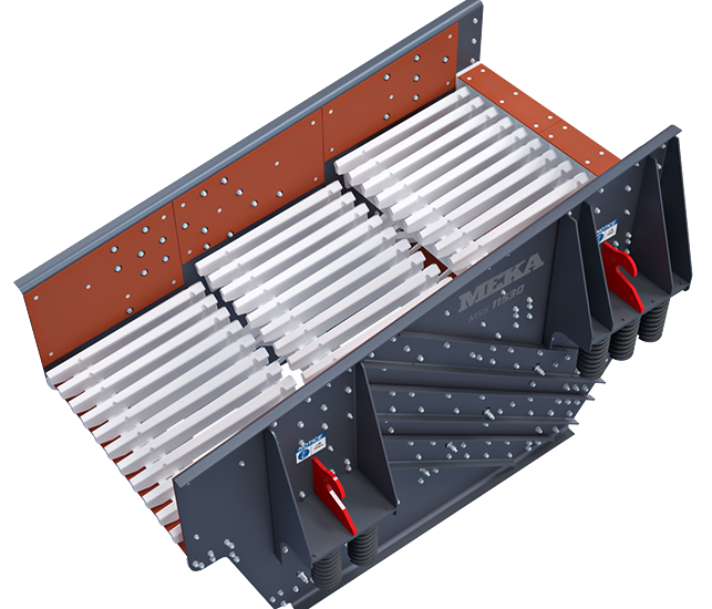 Скальпирующие грохоты MSS имеют прочную, сверхмощную конструкцию, рассчитанную на прием крупного материала и большого тоннажа. Эти грохоты чаще всего используются в сочетании с пластинчатым питателем, лотковым или вибропитателем перед первичной дробилкой. Они оснащены одной колосниковой или пластинчатой скальпирующей декой с возможностью установки второй деки с плетеной проволокой. Грохоты MSS, устанавливаемые сразу после первичного питателя, обеспечивают более эффективное скальпирование, чем первичный питатель со встроенными колосниками. Ход и скорость грохота остаются постоянными, в то время как скорость подачи регулируется путем изменения скорости питателя, что обеспечивает эффективное разделение в любое время.